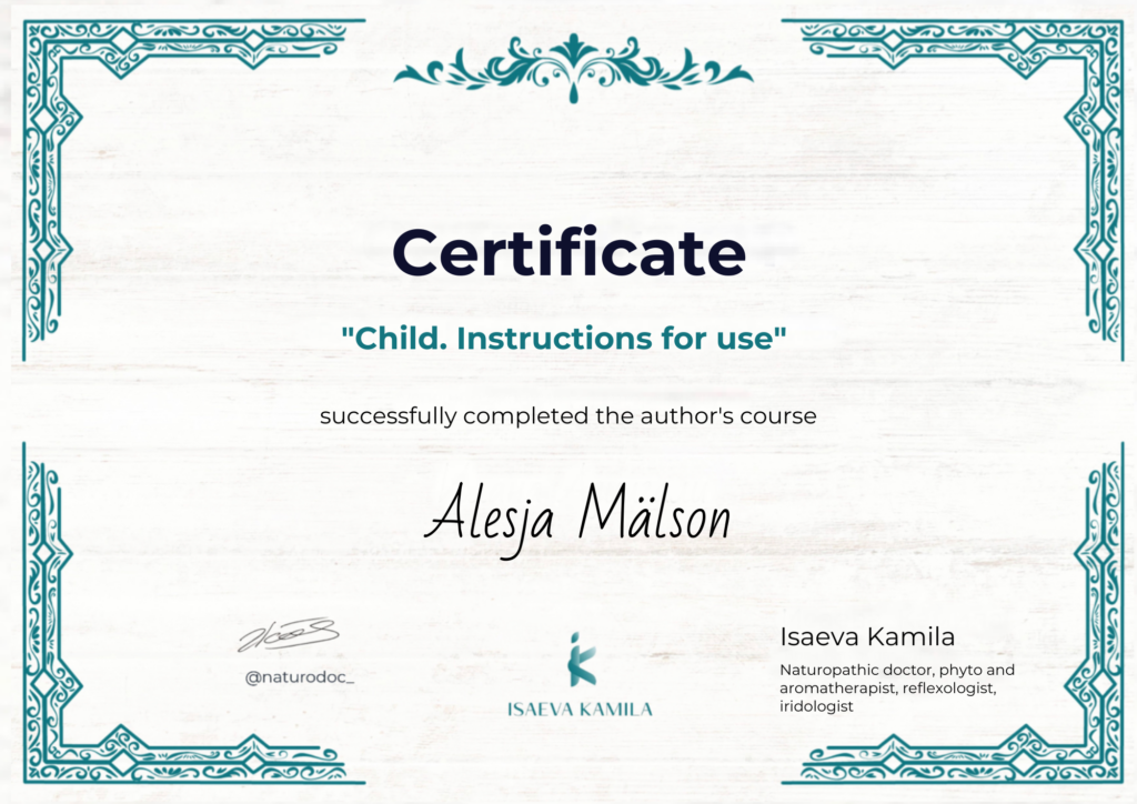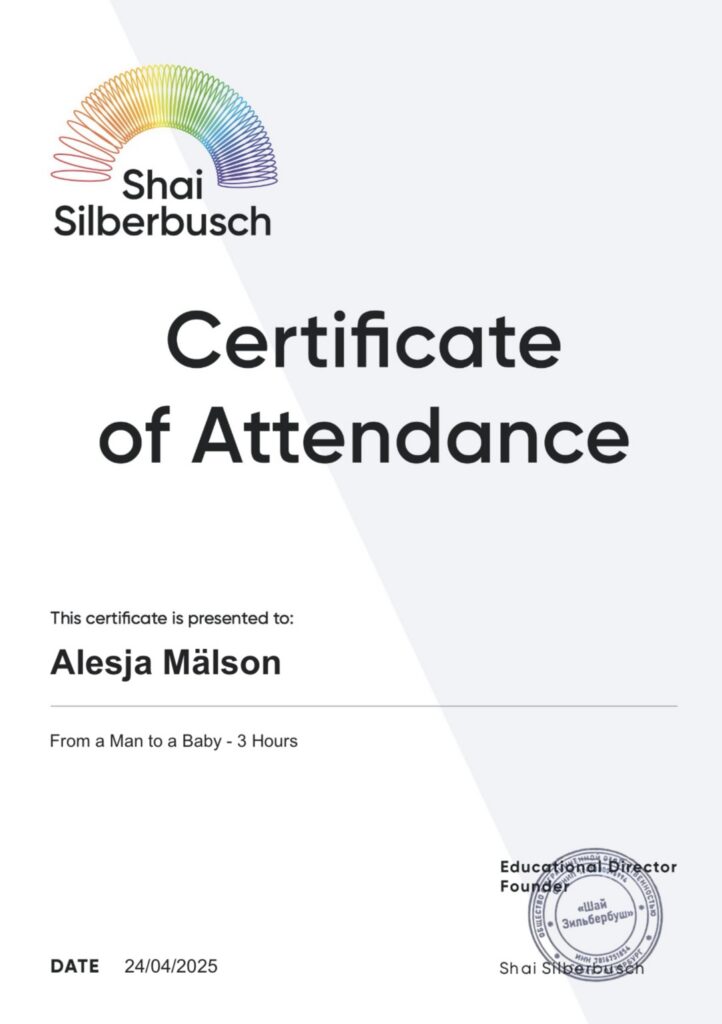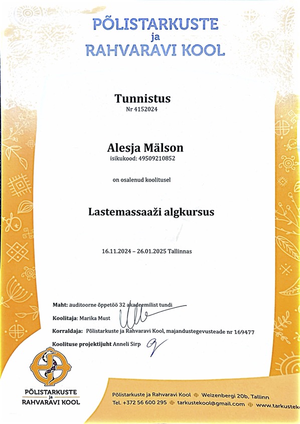 Oma töös kasutan aktiivselt ka teadmisi beebimassaažist. Alates 2026. aastast täiendan oma teadmisi meditsiinivaldkonnas Tallinna Tervishoiu Kõrgkoolis.